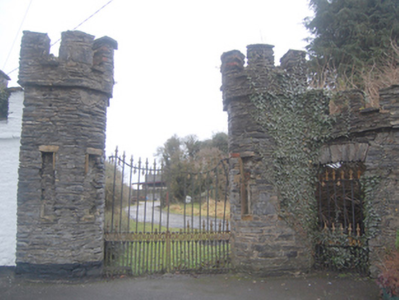 This castellated gateway formerly formed the main entrance gateway to the demesne of the former Church of Ireland Bishop’s Palace at Raphoe (see 40833005), the impressive ruins of which survive on high ground to the south. The castellated gate piers are robustly constructed with rubble stone masonry and make a strongly positive contribution to the streetscape to the most historic section of the town of Raphoe. The blind loop openings and the castellated parapet over mirrors the detailing to the palace itself. The date of the erection of this gateway is not readily discernible though they may date to the remodelling of the palace by Bishop Dr. William Bisset, shortly after his elevation to the see in 1822, who castellated the palace by adding ‘parapet walls … to give it the appearance of a castle ‘ (OS memoirs). However, is possible that this gateway is considerably antique in origin and may date back to the eighteenth century or, perhaps, earlier (there is no clear break in the stonework between the masonry of the flanking wall to the north and the adjoining structure (see 40833050), which probably dates to the first half of the eighteenth century). The attractive wrought- and cast-iron gates are interesting examples of historic metallurgy and add substantially to the context and section. The sections of castellated boundary walls to either side complete the setting. This gateway is an important element of the built heritage of Raphoe, and forms part of an extensive collection of structures associated with the Church of Ireland to the east side of the centre of the town. It forms a pair of related structures with the associated former gate lodge or building (see 40833050) to the north, which probably originally dates to the first half of the eighteenth century.