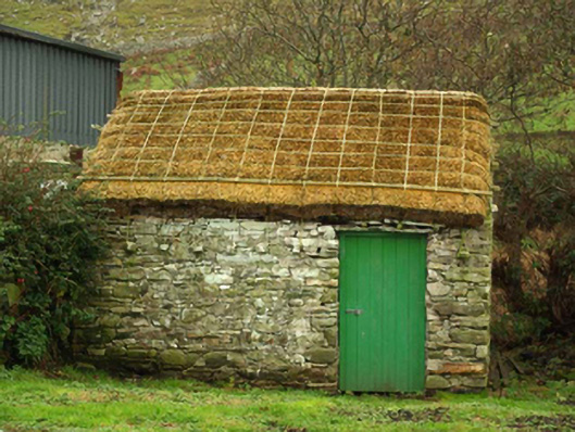 This charming thatched vernacular house retains its early form and character, and is an appealing feature in the rural landscape to the north of Gleann Cholm Cille/Glencolumbkille. Modest in scale, it exhibits the simple and functional form of vernacular building in Ireland. Of particular interest in the survival of the thatched roof, which is now sadly becoming increasingly rare in Donegal. The rounded roof is a typical feature of thatched houses located close to the sea in exposed areas in the north-west of Ireland, while the pegs to the eaves were used to tie ropes (and sometimes nets) over the roof to secure it against the prevailing winds. The form of this building having chimneystacks to the gable ends suggests that this building is of the ‘direct entry’ type that is characteristic of the vernacular tradition in north-west Ireland. This house represents a fine surviving example of a once ubiquitous building type in the rural Irish countryside, and is a valuable addition to the vernacular heritage of County Donegal. It is the only surviving thatched dwelling in a nucleated cluster of buildings or a clachan that has been in existence since c. 1837 at the latest (depicted on Ordnance Survey first edition six-inch map). The two thatched rubble stone outbuildings add considerably to the setting of this house and are significant survivals in their own right. The remains of the cast-iron water pump to the east adds to the context and setting.