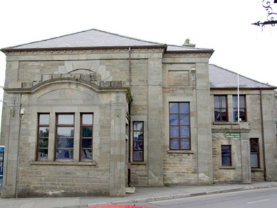 Detached corner-sited four-bay single-storey double-height courthouse on complex plan, built 1833, having two-storey over basement offices and former bridewell under same roofline to the rear (north-west). Extended in 1891 having single-bay porch to the front elevation (south-east) and two-storey split level extension to the north-west. Single-bay single-storey porch to the north-east elevation. Reconstructed in 1925 following fire damage in 1922. Now also in use as chamber of commerce offices. Hipped natural slated roofs having ashlar eaves course with modillions to front face (south-east) of original building. Ashlar sandstone chimneystack to the south-east block having stepped cut stone coping and terracotta pots over. Pitched roof to rear at north-west corner having rendered chimneystack and raised rendered verge. Plain ashlar sandstone eaves course to front (south-east) and north-east elevations. Rendered eaves course to the south-west elevation. Some remaining cast-iron rainwater goods including profiled gutters to the front elevation (south-east) of original block. Ashlar sandstone construction to the front elevation of the main block, and to the north-east elevation, with raised ashlar sandstone pilaster/quoin strips to the corners. Recessed rectangular panel above window opening to recessed bay to front elevation (south-east). Ashlar plinth to base. Ashlar sandstone construction to front porch having ashlar sandstone pilasters to corners with recessed rectangular panels, segmental-headed ashlar panel over window openings having moulded cornice, and ashlar blocks to parapet hiding flat roof. Ashlar sandstone construction to porch to north-west having ashlar sandstone pilasters to corners with recessed rectangular panels, moulded tassel motifs to head of pilasters, and with moulded cornice over. Smooth rendered walls to the south-west and north-east elevations of original block, and to the rear (north-west). Square-headed window openings having stone sills and replacement windows. Some two-over-two pane timber sliding sash windows remain to rear (north-west) elevation and to the recessed block to the north-east end of front elevation (south-east). Plain flush ashlar sandstone surrounds to window openings to front elevation (south-east) and flush ashlar sandstone block-and-start surrounds to the window openings to the north-east side elevation of original block. Tripartite arrangement to window openings to front face of porch; semi-circular window opening to front face of original building, over porch, having ashlar sandstone surround and spoked/radial glazing to window. Square-headed door opening to the north-east elevation of main porch having ashlar sandstone surround with lintel over having cornice and egg-and-dart detailing to frieze, replacement timber double-doors, and having overlight. Square-headed door opening to north-east face of porch to the north-east having flush ashlar surround and timber door. Square-headed door opening to the south-west elevation of original block having timber door and overlight. Doorway reached by flight of steps over basement level having wrought-iron railings. Gateway to the south-west side of main elevation (south-east) having cut stone gate posts and decorative wrought-iron gate. Wrought-iron railings over basement level to the north-west end of south-west side elevation; rendered boundary wall to the south-east end of south-west side elevation. Set back from road in prominent corner site facing the Diamond, Donegal Town, to the south-east. Yard to the east having modern railings. Interesting interior to courtroom having fixed timber bench seating, panelled dock, pedimented panel to rear of judge’s chair, gallery with cast-iron supports and timber panelled balustrade. Cast-iron fireplace to jury room.