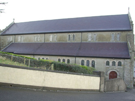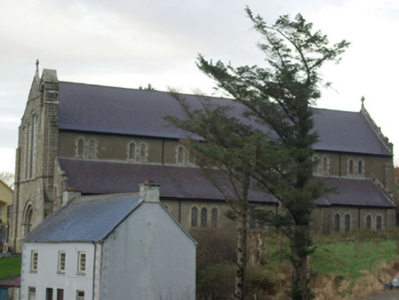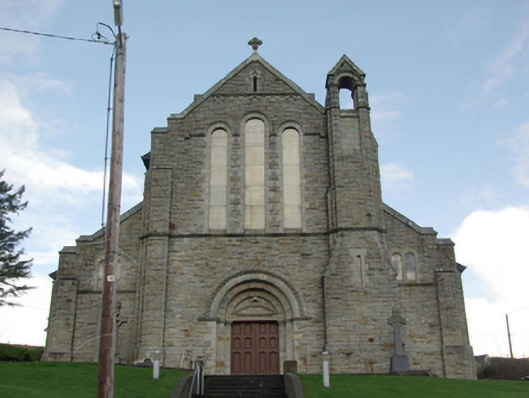 This ambitious Catholic church dominates the landscape to the east of Cill Chartha/Kilcar. Despite some alterations to the interior, it retains its early form and architectural character. The impressive and well-detailed entrance façade is particularly noteworthy, and helps to elevate this building above many of its contemporaries in Donegal. The level of cut stone detailing throughout and the scale of this church is in stark contrast to the plain, modestly-scaled former Catholic church (see 40844008) to the east (which the present church was built to replace), and illustrates the growing wealth and architectural ambition of the Church in Ireland at the time of construction. The round-headed openings, particularly the fine doorcase with tympanum, give this building a quasi-Romanesque architectural character to the exterior. The spacious interior impresses with the barrel-vaulted timber ceiling, the arcades to the side aisles supported on robust Tuscan columns, and the elaborate mosaic and fresco decoration to the altar area of particular interest. The layout of the interior - having side aisles with arcades of round arches, round-headed window openings at clerestory level, and barrel-vaulted timber ceiling - is reminiscent of Byzantine and Romanesque church architecture. The stained glass windows, particularly those to the chancel gable, are of a higher quality than is usually encountered at rural churches, and add further decorative interest to the interior. These windows were dedicated in 1927 and depict the Adoration of the Shepherds, Crucifixion, and the Last Supper among other scenes. This fine church was originally built to designs by Doolin, Butler and Donnelly architects, an architectural firm that carried out a large number of commissions for the Catholic Church in Ireland, particularly between c. 1904 and c. 1909. It was built for the then parish present of Cill Chartha/Kilcar, a Revd. McNelis, and was designed to accommodate 1,200 people. The main contractor involved was W.J. Campbell and Son, Belfast. The foundation stone was laid 4th of October 1903, and it was dedicated on the 4th of September 1904. This fine church, located in a prominent site dominating the local landscape, is a local landmark and an important part of the architectural heritage of the Cill Chartha/Kilcar area. The boundary wall and gateway to the south, the stone memorials, and the freestanding belfry to the north add to the setting and context, and complete this appealing composition.