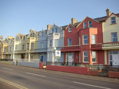 Terraced two-bay three-storey house, built c. 1890, having single-bay two-storey canted bay to the west end of the main elevation (north), balustraded balcony at first floor level running over main door, and with two gable-fronted bays at attic/third storey level. Now in use as a guest house. One of a terrace of eight (see 40851018–22; 40851024-25). Pitched natural slate roof with rendered chimneystacks to either end (east and west), shared with neighbouring buildings. Flat roof over canted bay projection. Cast-iron rainwater goods. Smooth rendered walls over rendered plinth; render decoration now removed. Square-headed window openings with replacement fittings. Paired window openings to western end bay at third floor level. Square-headed doorway to east end bay of main elevation (north) having replacement door with replacement glazed surround. Main doorway flanked by fluted pilasters having masked corbels over. Set back from road and to the south-west of Bundoran town centre. Bounded on road-frontage to the north by rendered plinth wall having decorative cast-iron railings over.