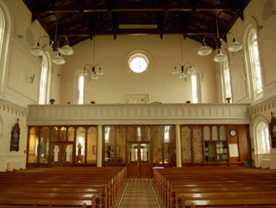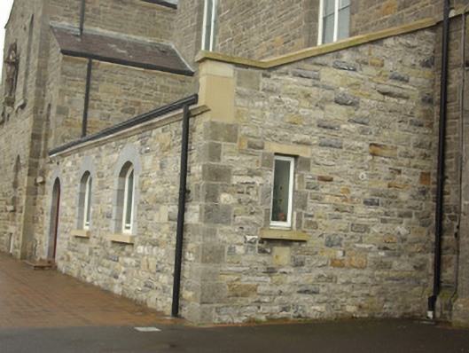 This substantial mid-nineteenth century Catholic church retains its early character and form. It is well-built with sparse - but high-quality - cut stone detailing to the exterior, particularly to the tower and spire. The rather austere detailing to the exterior is contrasted by the rich classical stucco work and the elaborate timber roof to the vast, open interior. The round-headed window openings lend it a vaguely Romanesque appearance to the exterior, while the belfry and spire to the tower have a Gothic-Revival character. The soaring broached spire dominates the skyline to the north of Ballyshannon town centre, dwarfing the earlier tower of the Church of Ireland church (40852016) to the west; the nave of which was rebuilt around the same time (1841). This building is unusually large for its date and type, suggesting the financial input of rich local Catholic merchants etc. This building was built to designs by the eminent architect John B. Keane (d. 1859), the architect responsible for a number of large-scale projects for the Catholic church in the 1840s, including the original designs for St. Mel’s Cathedral, Longford Town (13002327). Keane was also responsible for the rebuilding of nearby Camlin Castle (later demolished as part of Erne Hydro-Electric Scheme in the 1940s/50s) and the associated gateway (see 40910748) for the Tredennick family c. 1838. The main contractor involved in the construction of St. Patrick’s Church was a Daniel Campbell (of Pettigoe?), who left his mark on the date plaque over the doorway to the tower, and the foundation stone was apparently laid in May 1842 by the Revd. Dr. McGettigan. The church was built at a cost of £1,380, and enormous sum of money for the Catholic Church in Ireland at the time (Begley 2009). The canted/polygonal apse to the church was added in 1860 to designs by the important Gothic Revival architect James Joseph McCarthy (1817 - 82), while a new roof (and a Celtic cross-style memorial to Dr. Sheil) was added in 1893 to designs by another eminent architect, William Henry Byrne (1844 – 1913). The present church occupies the site of an earlier Catholic place of worship, built in 1795 (Lewis 1837). This building was apparently originally built as a simple rectangular or hall-type building (Begley 2009), but is depicted on the Ordnance Survey first edition six-inch map (c. 1836) as a small T-plan structure. This church was in need of substantial work in the 1830s and the then parish priest, a Revd. Cummins, decided to build a new church, the present edifice. This fine building is an important element of the built heritage and social history of Ballyshannon, and is a landmark feature overlooking the town to the north.
