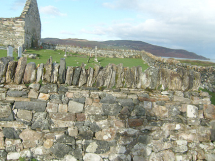 Remains of three-bay single-cell church, built c. 1550 and repaired and rebuilt c. 1620, and c. 1700. Now ruinous. Pitched roof, now removed\collapsed, having projecting eaves course to north and south, remains of stone coping to gable ends, and with rubble stone bellcote to the west gable end. Constructed of rubble stone masonry, formerly rendered, having small rubble stone pinnings. Two segmental-headed window openings to the south and north elevations, now blocked with rubble stone masonry, having rubble stone voussoirs over. Segmental-headed window opening to the east gable end, now blocked with rubble stone masonry, having rubble stone voussoirs over. Square-headed doorway to the west end of the south elevation having replacement lintel and segmental-headed relieving arch over with rubble stone voussoirs. Sections of plaster survive to interior walls. Memorial to William Wray, dated 1710, to interior comprising marble tablet (on rectangular-plan) with inscribed text, cornices to base and head, and surmounted by stone tablet with crest of the Wray family flanked to either side by upturn console brackets. Graveyard to site (on sub rectangular-plan) with collection of mainly eighteenth and nineteenth century upstanding and recumbent memorials, some with metal railed enclosures. Site surrounded by rubble stone boundary wall with fieldstone soldier coping over. Gateway to the south-west of site comprising a pair of rubble stone gate piers (on square-plan) having rubble stone coping over, and with wrought-iron flat bar gate. Located in the rural countryside to the south\south-east of Dunfanaghy. Modern graveyard to the west and group of graveyards (see 40901521) located adjacent to the east.