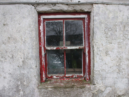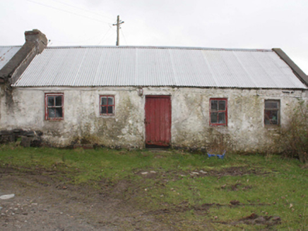 Attached four-bay single-storey vernacular house, built c. 1800, with single-storey outbuildings to east gable; modern house extension to west gable. Pitched corrugated-metal roof with smooth rendered gable coping and smooth rendered chimneystack to east gable. Roughcast rendered and whitewashed walls. Square-headed window openings with two-over-two pane horned timber sliding sash windows. Central square-headed door opening with battened timber door. Set within farmyard with contemporaneous outbuildings with pitched corrugated metal roofs, roughcast rendered and whitewashed walls and square-headed openings to east gable. Set within farmyard with modern farm buildings to north and east.