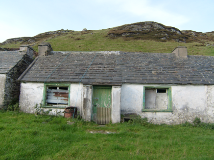 Pair of three-bay single-storey vernacular houses, built c.1820, with windbreak entrances, having outbuildings to north and south. Now in use as outbuildings. Pitched Roshin slate roofs with rendered chimneystacks, and having flat slate roofs to windbreaks. Limewashed and lime-rendered stone walls. Square-headed window and door openings with stone sills and remains of six-over-three pane timber sliding sash windows, and timber battened doors. Windows to northern house enlarged, with raised smooth-render band and concrete sills. Outbuildings have pitched Roshin slate roofs, limewashed rubble stone walls and square-headed openings. Buildings set with back to and parallel with road. Two-bay single-storey outbuilding to north, with pitched Roshine slate roof and limewashed rubble stone walls.