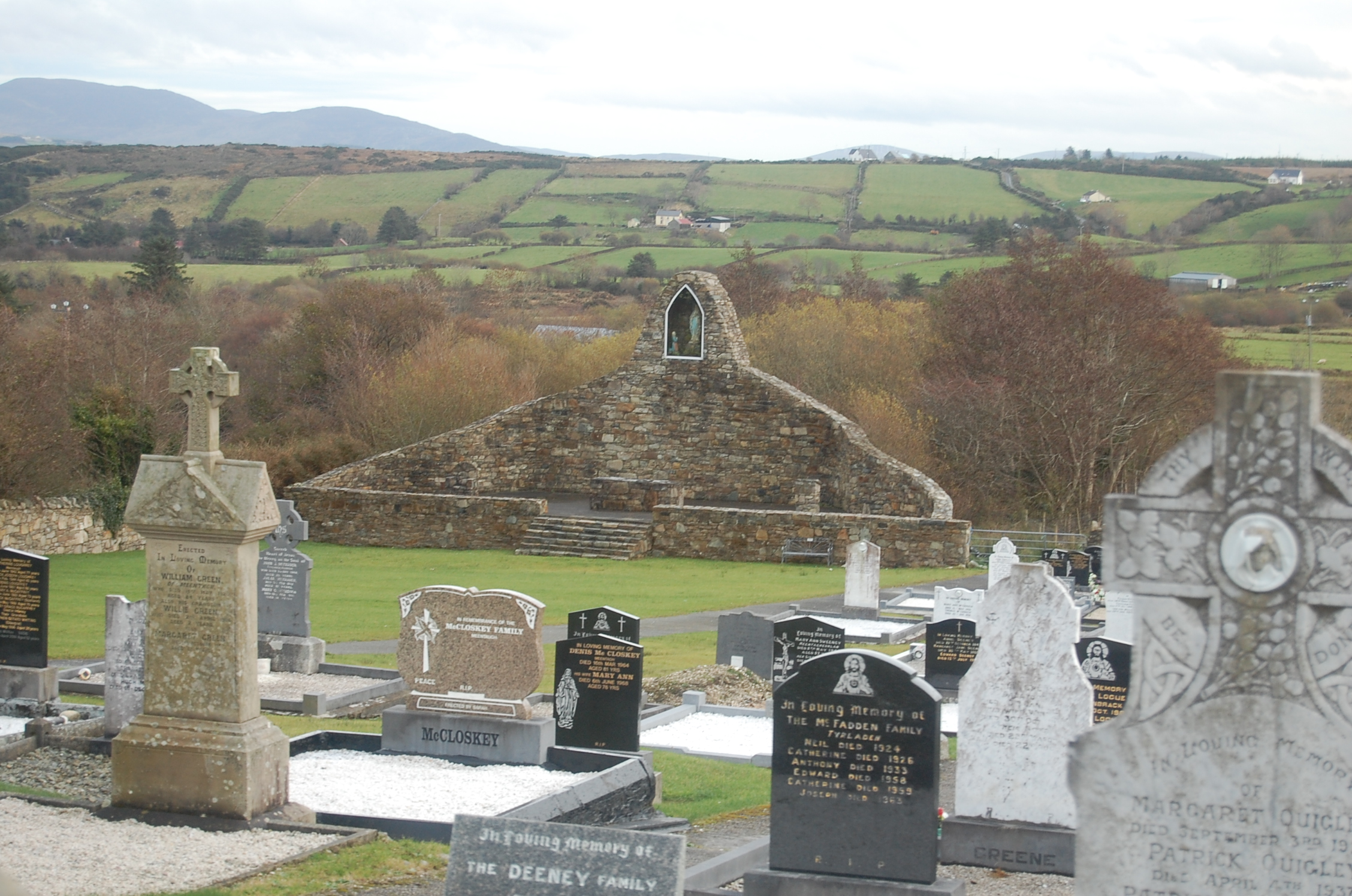 Freestanding Catholic Church, built 1862, having four-bay nave, lower gabled chancel to east, porch to west and lean-to sacristy to northeast. Pitched purple slate roof with raised eaves course, rendered copings with kneeler stones and stucco cross finials, and cast-iron rainwater goods. Roughcast rendered walls with smooth rendered plinth and quoins. Pointed-arch windows openings, triple-light (c.1943) to chancel, with raised rendered surrounds, painted concrete sills and stained-glass windows inset with leaded quarries and having weather-glazing. Square-headed doorway to porch having timber battened double-leaf door with raised smooth render surround. Interior has exposed timber scissors truss roof with painted timber sheeted ceiling, drip-mould to chancel arch, and with moulded sill course to backdrop of sanctuary. Set at angle to road, with freestanding bell-stand having bronze bell on cast-iron columns atop stepped concrete plinth. Low rendered boundary wall and hedgerow to road. Graveyard on opposite side of road.