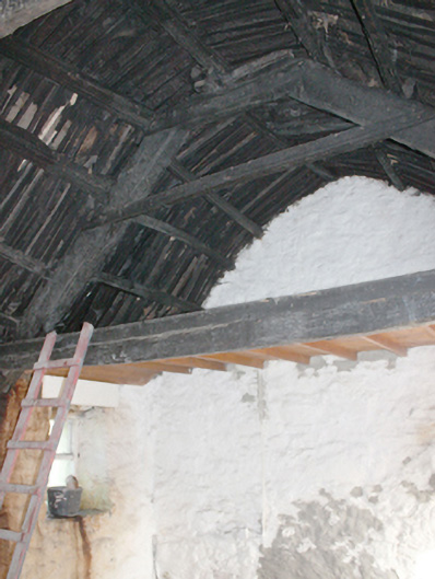 A thatched vernacular house which at the time of survey was under restoration. A good surviving example of a disappearing vernacular type which has preserved its characteristic features including direct-entry layout, whitewashed stone walls, rear bed outshot, and shallow projecting stone front porch. Although hidden behind a modern panel, the front sash windows have been retained, which add to its architectural and aesthetic value. Inside, the preservation of the handsome stone chimney at the west gable, the remains of the timber frame of the bed outshot, the slab stone flooring and the loft with the timber ladder contribute to its authenticity and character. House is shown on the Ordnance Survey first edition six-inch map of c. 1837.