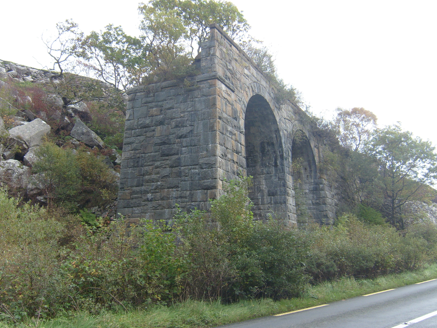 Former railway viaduct taking former Letterkenny to Burtonport line over An Bearnas [Barnes Gap], erected c.1903, comprising two rusticated arches to southeast and two freestanding rusticated stone piers to northwest, formerly carrying steel girders. Rusticated stone voussoirs forming round arches, with coursed rusticated masonry with drafted margins to spandrels and extending to low parapet having concrete copings with string course at springing level of arch to northwest. Coursed rusticated piers with drafted margins and ashlar rusticated copings.