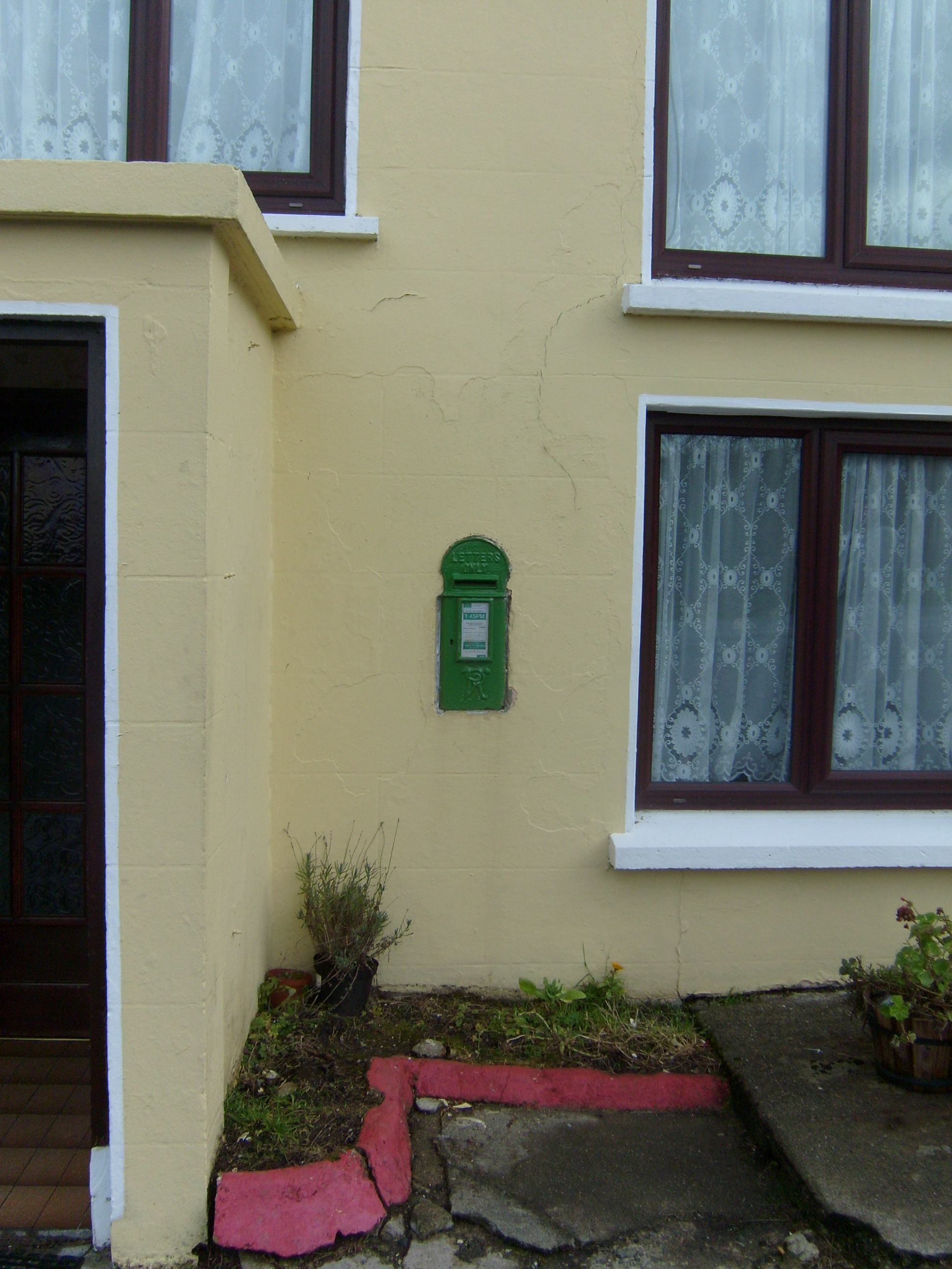 Wall-mounted cast-iron post box, installed c.1870, having round-headed moulded front panel with raised lettering 'VR' to bottom. Set in rendered front wall of house and shop.
