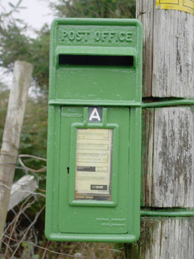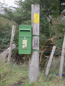 Cast-iron post box, erected c. 1935, having ‘Post Office’ in raised lettering over projecting letter flap and ‘Carron Company Stirlingshire’ foundry mark to the base. Still in use. Secured to timber post/pole in the rural landscape to the east/north-east of Gleann Cholm Cille/Glencolumbkille adjacent to road junction.