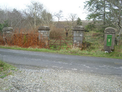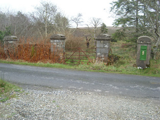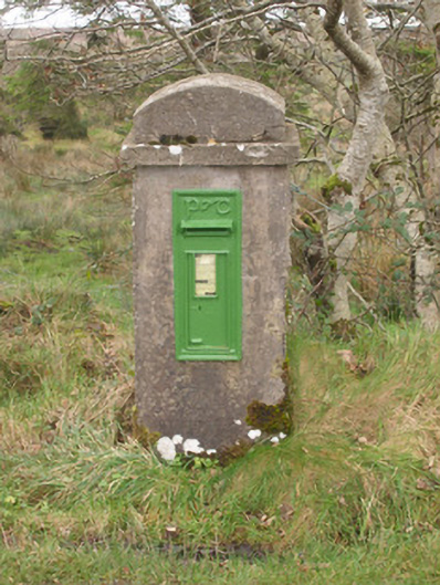 Wall-mounted cast-iron post box, erected c. 1940, with raised 'P&T' monogram in Gaelic script to head and with foundry mark to base reading ‘Jessop Davis, Enniscorthy’. Still in use. Set into rendered gate pier adjacent to site of Croagh Post Office, now demolished. Located adjacent to road in the rural landscape to the north of Dunkineely, and to the south-east of Ardara.