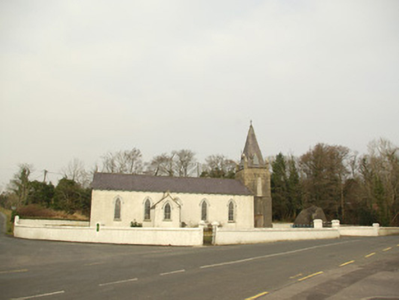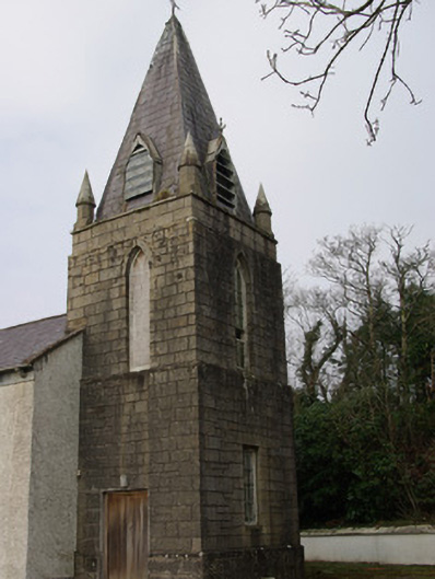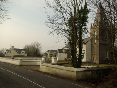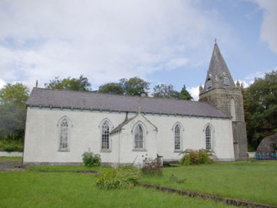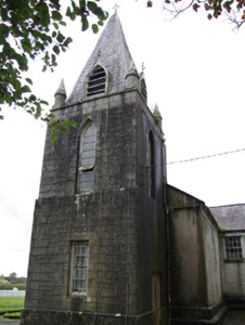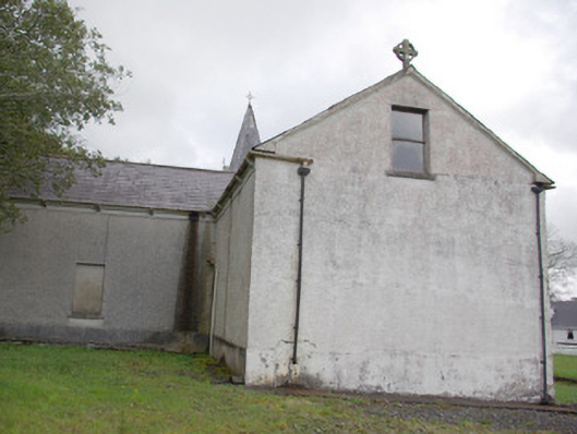Freestanding Catholic church on T-shaped plan, built or rebuilt c. 1858, having five-bay nave to the west, transept to the north, and with two-stage tower to the east (on square-plan) having cut stone corner pinnacles and with slated spire over (added c. 1890). Single-bay gable-fronted entrance porch to the centre of the south elevation of the nave. Now no longer in use (replaced by modern church to the south built in 1984). Possibly containing fabric of earlier church to site (on Ordnance Survey first edition six-inch map of 1837). Natural slate roofs with moulded stone corbels at eaves levels, and having cast-iron rainwater goods. Cut stone Celtic cross finial to the west gable end of nave; raised verge to the east end of nave. Natural slate covering to spire having courses of fish-scale slates and with lucarnes, wrought-iron cross finial over. Roughcast rendered walls to main body of building having smooth rendered plinth course and smooth rendered eaves course. Ashlar construction to tower over chamfered ashlar plinth. Pointed-arched window openings to south elevation of nave having moulded rendered surrounds, hoodmouldings over, stone sills, and with timber multi-paned timber sliding sash windows with intersecting glazing to head. Square-headed window opening to the east face of tower at ground floor/first stage level having timber sliding sash window with margin glazing bars; pointed-arched window openings to second stage of tower having timber sliding sash windows; pointed-arched lucarnes to slated spire having timber bargeboards and timber louvers. Square-headed window openings the west elevation of nave, to transept, and to the east face of tower at ground floor level having either timber sliding sash windows or replacement windows; some opening s now boarded. Pointed-arched window opening to the south face of porch having moulded rendered surround, hoodmoulding over, stone sill and with four-over-two pane timber sliding sash windows. Square-headed doorway to the east face of porch having render surround and timber door. Square-headed doorway to the south face of tower having timber doors. Set back from road in own grounds to the north of Donegal Town centre. Located adjacent to rural road junction. Site surrounded by rendered boundary wall. Pedestrian gateway to the south-west comprising a pair of chamfered ashlar gate piers/posts (on square-plan) having wrought-iron gate; vehicular gateway to the south-east having rendered gate piers (on square-plan) with mild steel or wrought-iron gates. Graveyard to site having three memorials; main parish graveyard to the west. Marian grotto to the east of tower having rubble stone construction. Post box (see 40909321) set into boundary wall to the west.
