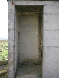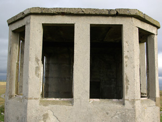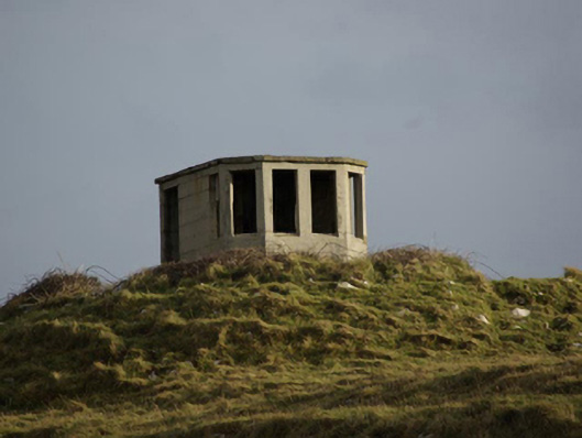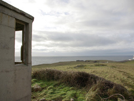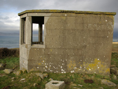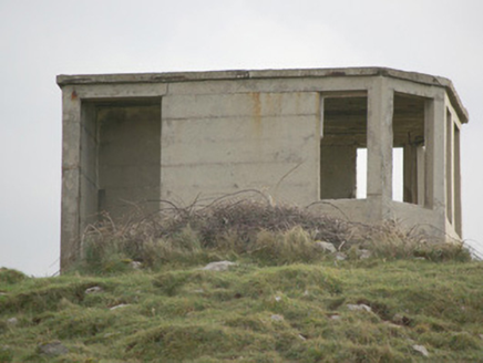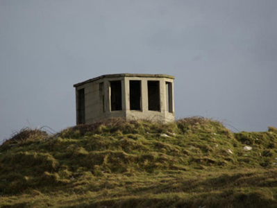This unassuming former World War Two-era former watchman’s hut is a structure of some historical interest. It was originally built by the Irish Army/Navy to keep watch for shipping, submarine, and aircraft activity in and over Irish waters during the Second World War, details of which was subsequently reported back to central command. It was one of over eighty such structures built along the Irish coastline in the first years of the war. It is a simple structure constructed of mass reinforced concrete and was designed to provide basic comfort for the watchman/men on duty, having a fireplace to one wall. They were equipped with telephone, semaphore, and Morse code machines. The canted front provided an excellent view in three directions. It is one of a number of such surviving structures in County Donegal, and acts as a subtle historical reminder of this period in Irish history. Located in a dramatic coastal location and surrounded on three sides by the Atlantic Ocean, this structure is an integral element of the built heritage and maritime heritage of the local area. It is located adjacent to the site of a former Napoleonic-era signal tower, now demolished above ground level, which attests to a long running strategic interest in this location.