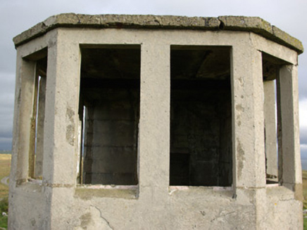 Remains of single-bay single-cell single-storey World War Two-era coastal watchman’s hut, in use c. 1939 – 45, having canted front elevation (south-west). Now out of use. Flat concrete roof. Mass concrete walls having square-headed window openings, fittings now gone. Square-headed doorway to the north-west elevation, fittings now gone. Fire place to interior at the north-east end. Located in a prominent elevated location on an elevated site close to the tip of St. John’s Point, and adjacent to the lighthouse (see 40909717), with extensive sea views to three sides. Located close to the site of a former Napoleonic-era signal tower, now largely demolished above ground level.