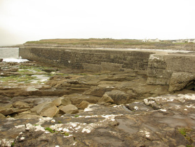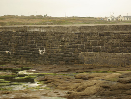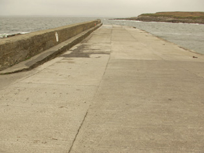 Pier/jetty, built 1880 - 85, having storm wall to the west elevation and with stone flagged slipway adjacent to the east. Still in use. Walls constructed of snecked mildly rock-faced masonry with concrete deck and with concrete coping over storm wall. Flight of cut stone steps to the north end of the east elevation giving access to water level. Cut stone coping to east edge of deck; metal rope rings and metal chains to east edge of pier. Concrete paved road to pier from the east having coursed and squared rubble stone retaining walls to seafront; metal winch located along approach road. Stone slipway to the east end of retaining wall having stone cobbles to deck and with coursed rubble stone retaining walls. Pier juts out into Donegal Bay to the north of Bundoran and to the north-west of Ballyshannon.