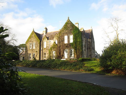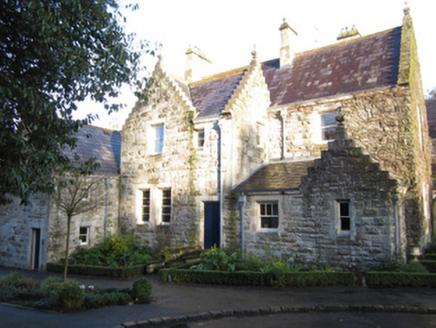 Attached complex-plan six-bay two-storey former dower house in use as hotel accommodation, built c.1875. Front, south-east, elevation has shallow and projecting gabled end bays, with gabled porch to re-entrant corner of projection. South-west bay of same elevation is recessed and is gable-fronted and has part lean-to and part gabled porch to front, latter slightly recessed. South-west elevation has projecting lower two-bay two-storey return at rear. North-east elevation is three-bay two-storey with projecting gabled middle bay. Pitched H-plan slate roof, with terracotta ridge tiles, cut limestone chimneystacks, crow-stepped gables to bays and to most first floor window openings, with carved limestone finials to all gables, moulded limestone cornice to eaves, and cast-iron rainwater goods having square-profile cast-iron hoppers. Squared rock-faced limestone masonry with ashlar dressings. Square-headed window openings, with chamfered block-and-start ashlar surrounds and one-over-one pane timber sliding sash windows. Square-headed door openings, with chamfered block-and-start ashlar surrounds and timber panelled doors. Attached at north-west to range of two-storey outbuildings of similar style and date. Building set within mature parkland at entrance to Castle Leslie demesne.