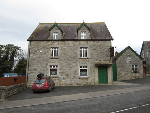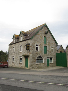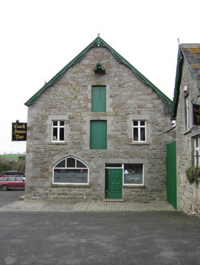 Attached two-storey public house with dormer floor, built c.1880, having three-bay ground floor and two-bay first floor. South-east side elevation has two-bay ground floor and three-bay first floor. Two-storey house or outbuilding and yard to rear, accessed through corrugated-metal gate. Pitched slate roof with decorative timber bargeboards having timber finials to gables and to front dormer windows. Hammer-dressed limestone walls built to courses, with cut-stone quoins. Square-headed window openings, first floor and dormers having mullion and transom frames, and ground floor having replacement timber frames, all having cut limestone lintels and block and start surrounds, segmental relieving arches, and cut limestone sills. Pointed segmental former carriage entrance to south-east gable, having rebated cut limestone surround and voussoirs, converted to window, bearing metal upper eyes for hanging doors. Square-headed replacement timber door to front elevation, having smooth rendered surround and step. Square-headed combined door and window to south-east gable with cut limestone lintel and surround and segmental relieving arch, replacement timber fittings, and limestone step. Upper floors to south-east gable have square-headed former pitching doors with cut limestone lintels and block and start surrounds, and battened timber doors. Pitching door to east gable with sack hoist.