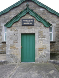 Gable-fronted single-storey Church of Ireland hall, built c.1820, having three-bay front, abutting south-west corner of property to north, and having gabled porch to front, and two-bay extension to rear. Pitched slate roof with decorative timber bargeboards to front gables with saw-tooth dentils and carved timber finials. Random rubble hammer-dressed limestone walls with squared block-and-start quoins, and having ashlar block-and-start quoins to porch. Square-headed window and door openings to front elevation with ashlar limestone block-and-start surrounds and lintels, pointed relieving arches to window openings, replacement timber windows, cut-stone sills, and timber battened door. Pointed-arch window opening to south-west side elevation with replacement uPVC window, red brick surround and cut-stone sill.