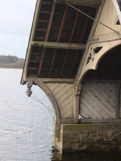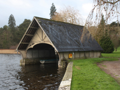 This boathouse forms part of the collection of interesting demesne features at Castle Leslie. Its medieval-style structure and detailing is notable, and the quality of timber dressing and carving is evident. It was constructed to make use of the lake as a pleasure ground.