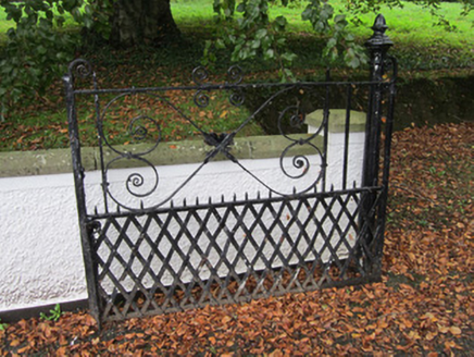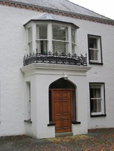 Detached three-bay two-storey house, built c.1880, facing south, having single-storey entrance porch with canted first floor window over, gabled two-bay two-storey and single-bay two-storey lean-to extensions at rear, with further single and two-storey outbuildings forming enclosed rear yard. Hipped slate roof with black clay ridge tiles, slightly sprocketed eaves, late twentieth-century rooflights on rear and side elevations, two red brick chimneystacks either side of central bay on ridge having over-sailing brick courses and dark vitrified brick stripe, and stepped brick cornice with brick corbels holding ogee-profile cast-iron rainwater goods. Painted roughcast rendered walls with rusticated smooth render block-and-start quoins and flat smooth render frames around window openings. Smooth render to ground floor main entrance porch which has moulded render entablature surmounted by ornate wrought-iron brattishing and square-headed windows to side walls. Square-headed window openings throughout with painted stone sills and one-over-one pane timber sliding sash frames with mixture of chamfered and ogee horns. Window over porch has half-pyramidal slate roof with rolled lead ridges and similar sash windows separated by plain timber mullions. Tudor-arch entrance doorway with panelled timber door, overlight and sidelights with painted stone sills. Walls to rear yard are smooth rendered externally and mostly roughcast rendered internally, and yard entered through ornate double-leaf wrought-iron gate set to rendered square-plan piers. House situated in lawned garden surrounded by mature trees with winding hard surfaced avenue leading from widened entrance in roughcast rendered garden wall with original width ornate double-leaf wrought-iron gate on ornate cast-iron posts. Modern farm buildings to rear of site.