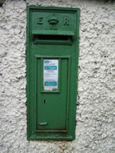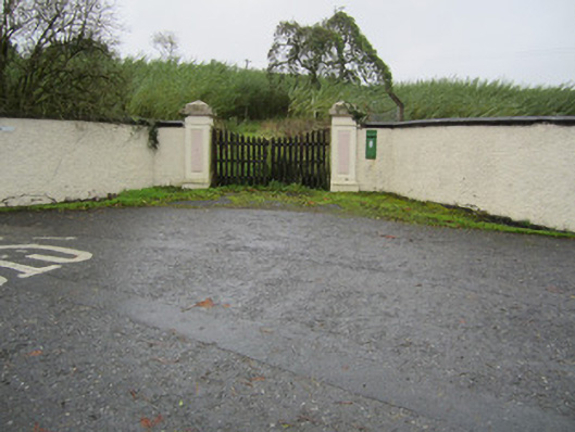 Wall-mounted cast-iron post box with hinged door, installed c.1901-10, with banded margin surround, projecting letter slot embossed with raised 'POST OFFICE' insignia, ER VII royal cipher to upper portion, 'W.T.Allen & Co. London' foundry cast to bottom. Set into roughcast rendered section of eastern gateway to Gallanagh House, north-west of Monaghan Town.