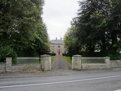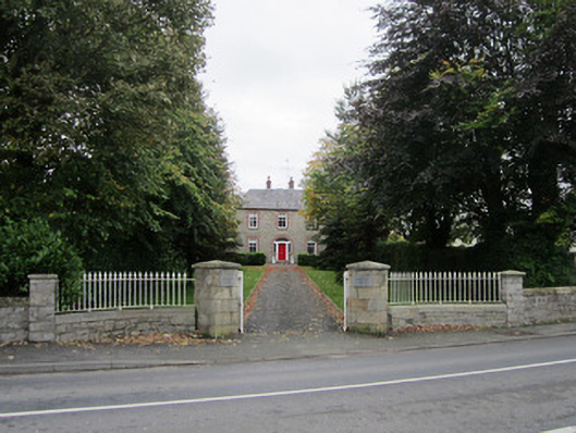 Detached three-bay two-storey house, dated 1875, with multi-phase, two-storey lean-to extensions to rear effectively adding further pile to rear south elevation of building, and with single-pitch two-storey outbuilding to west side of rear elevation having late twentieth-century conservatory to east side of south elevation. House has hipped slate roof with lead ridge, ogee-profile cast-iron rainwater goods on brick eaves course, and two brick chimneystacks arranged on ridge either side of entrance bay with tall, decorative octagonal clay pots. Rear elevation and all extensions have fibre-cement tiled roofs with late twentieth-century rooflights to rear elevation of house roof. Punch-finished random ashlar walling to façade and side elevations of house with ashlar sandstone block-and-start quoins, projecting sandstone platband between floor levels and projecting sandstone plinth. Separate random ashlar can be seen to early section of rear extension on west elevation with roughcast render to later extensions and to single-pitched rear outbuilding. Square-headed window openings with brick arched heads, block-and-start brick surrounds, stone sills and two-over-two pane timber sliding sash frames with chamfered horns. Windows to rear elevation and on later extensions to sides have replacement uPVC frames. Segmental-headed main entrance doorway with fluted and chamfered timber frame, leaded sidelights flanking four-panel timber door with chamfered detail around panels, brass door furniture and glazed fanlight over with inscription on glass 'Tranquilla 1875'. Stone step in front of main entrance doorway with sandstone flags around base of façade. House fronts onto lawned garden having mature hedges and trees to either side with straight, hard-surfaced avenue leading to Clones Road through offset square ashlar sandstone piers with corner rather than face of piers face forward. Piers hold cast-iron gates with curved cast-iron railings on ball feet held on low squared rubble curved walls adjoining squared rubble square piers connected to taller walls with sandstone coping extending north-east and south-west from entrance.