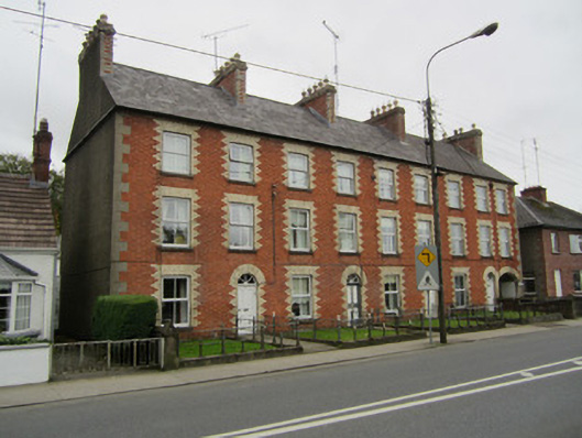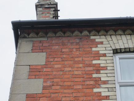 End-of-terrace three-bay three-storey house, built c.1880, with single-bay two-storey return to rear. Pitched natural slate roof with polychromatic chimneystack with stepped cornice and polygonal terracotta pots, cast-iron rainwater goods, and yellow brick cogging eaves course. Red brick walling to front elevation, laid in Flemish bond, with ashlar sandstone block-and-start quoins and chamfered sandstone plinth. Yellow brick block-and-start surrounds to openings. Smooth rendered walls to rear elevations. Square-headed window openings with replacement uPVC windows, and sandstone sills. Round-arched door opening with timber panelled door having spoked timber fanlight, and sandstone threshold. Set back from street with garden to front with boundary demarcation comprising saddle-back stone plinth surmounted by railings of cast and wrought iron. Terrace of two-storey outbuildings to rear having pitched natural slate roof, smooth rendered random rubble walls, and square-headed openings. House constitutes one of a terrace of four largely identical houses.