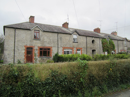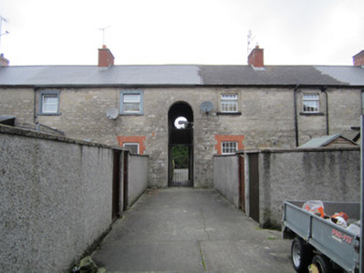 Detached nine-bay two-storey former infantry barracks, built c.1800, possibly remodelled 1914. Now forming terrace of four houses, with gablets to front elevation, and central archway giving access to courtyard to rear. Hipped slate roof to front pitch, replacement artificial slate to rear, grey clayware ridge-tiles, red brick chimneystacks with terracotta pots, cast-iron rainwater goods, and with timber bargeboards to gablets. Random rubble limestone walls with tooled ashlar block-and-start quoins. Camber arch window openings to ground floor, with red brick block-and-start surrounds, and painted sills. Square-headed window openings with tooled ashlar block-and-start surrounds to first floor. Replacement windows throughout. Oculus opening to first floor of central bay, over entrance archway, with smooth-rendered brick surround, and keystone. Full-height round arch entrance to rear elevation, with dressed limestone block-and-start surround and keystone. Set back from street with former yard divided into domestic yards to rear; principal building to barracks directly to south east enclosing courtyard.