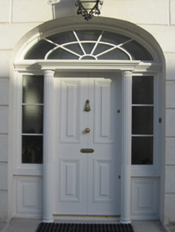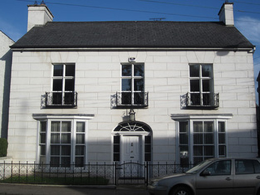 End-of-terrace, slightly projecting, three-bay two-storey house, built c.1870. Pitched artificial slate roof, having smooth rendered chimneystacks, and replacement rainwater goods. Channelled smooth rendered walling to front elevation, smooth rendered to south gable. Square-headed canted-bay windows to ground floor with four-over-four pane timber sliding sash windows having two-over-two pane side lights, with ornate wrought-iron balconettes. Square-headed openings to first floor having stone sills and timber casement windows. Elliptical-headed door opening, with timber doorcase comprising engaged fluted columns, moulded cornice, paned sidelights, and spoked fanlight, with timber panelled double-leaf door having moulded panels. Lawned garden to front, bounded by smooth rendered plinth walls surmounted by decorative wrought-iron railings and pedestrian gate.