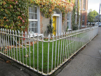 End-of-terrace three-bay two-storey house, built c.1870. Pitched artificial slate roof, with smooth rendered chimneystack, and replacement rainwater goods. Squared coursed stone walling to front elevation with rendered string course between floors, and roughcast render to north gable. Square-headed window openings, with red brick block-and-start surrounds, stone sills and replacement uPVC windows. Ogee-headed opening to north gable attic. Elliptical-headed door opening, with Ionic portico comprising fluted columns and moulded entablature with long rusticated panel, elaborate fanlight, and moulded timber panelled door. Lawned garden to front, bounded by cast-iron railings with fleur-de-lys finials, and pedestrian gate.