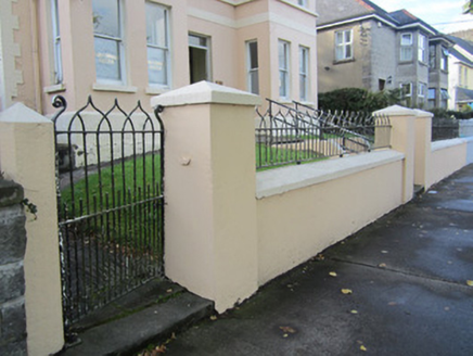 Detached three-bay two-storey house, built c.1870, having box-bay projections to end bays, and lean-to extension to south gable. Now in use as offices. Pitched slate roof, having projecting eaves with decoratively detailed dentillated cornice, pierced decoratively carved timber bargeboards to projections, brick stretcher bond chimneystacks, with dentillated corbelling to northern stack, and replacement rainwater goods. Smooth rendered walling to front elevation, roughcast render to gables, with painted brick block-and-start quoins, stone sill course to first floor, painted brick band between floors, and smooth rendered plinth. Square-headed window openings, with stone sills and one-over-one pane horned timber sliding sash windows. Square-headed door opening, with timber panelled door and overlight, with cut-stone steps. Lawned garden to front, bounded by smooth rendered wall with ogee-detailed wrought-iron railings and pedestrian gate, latter set mounted on smooth rendered gate piers.