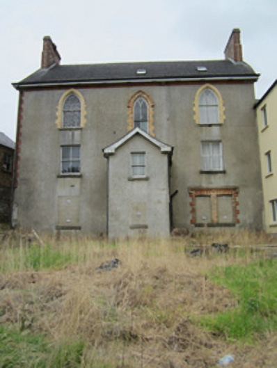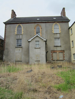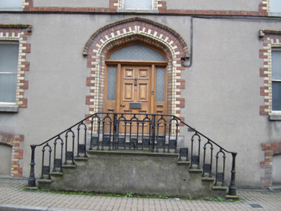 This Masonic hall is notable for its profusion of polychrome brick detailing, which serves to relieve an otherwise rather plain and large facade. A Tudoresque theme, evident with the Orange Hall on North Street, is here again evident. The raised ground floor of the building gives it an air of elegance and formality. The subtle stone elements provide some contrast with the render and brick work, and the decorative balustrade to the steps adds some artistic detail. Symbols in a rear window testify to the building's use as a Masonic hall, emphasising the mixed society found in County Monaghan.