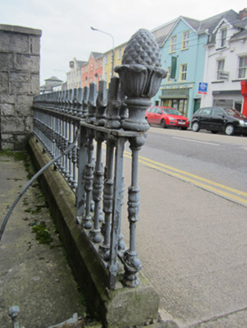 Attached three-bay two-storey house, built c.1870, with breakfront to middle bay, two-bay side elevation, and four-bay rear elevation with single-storey return and outbuilding to north end. Pitched slate roof, with rooflights to rear, projecting eaves, timber cornice and bargeboards, smooth rendered ruled-and-lined chimneystacks, and cast-iron rainwater goods. Smooth rendered ruled-and-lined walling to front (west) elevation and south gable. Front and south elevations have continuous string course between floors, and plinth course. Smooth rendered walling to rear and to north gable. Square-headed window openings with slightly projecting rendered keystones, and having stone sills and replacement timber windows. Round-headed opening to first floor of breakfront. Round-headed doorway with slightly projecting smooth rendered architrave and with keystone having moulded top immediately underlying string course, plinth blocks, fanlight and timber panelled door. Bounded to front by smooth rendered plinth walling surmounted by decorative cast-iron railings with acorn finials next to entrance. Dressed stone gate piers to vehicular entrance to south with pyramidal caps and double-leaf wrought-iron gate. Four-bay outbuilding to rear with lean-to corrugated-iron roof, roughcast rendered walls and square-headed openings.