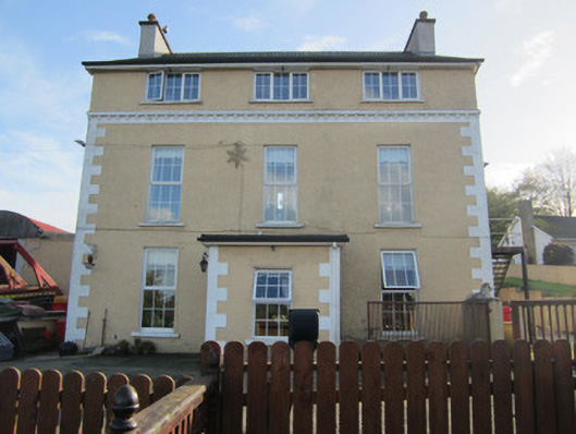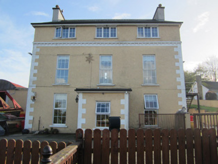 Detached three-bay two-storey house, built c.1800, with later second floor and later flat-roofed porch to front, and with single and two-bay three-storey returns to rear. Pitched slate roof with hooped terracotta ridge tiles, roughcast rendered chimneystacks with polygonal pots, and replacement rainwater goods. Roughcast rendered walls with block-and-start rendered quoins, dentillated string course to level of original eaves. Square-headed window openings with painted sills and replacement uPVC windows. Square-headed replacement uPVC door opening to porch. Set within own grounds, with two-storey outbuilding to rear having pitched corrugated-iron roof and roughcast rendered walls.