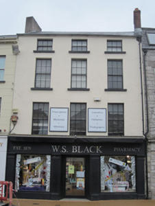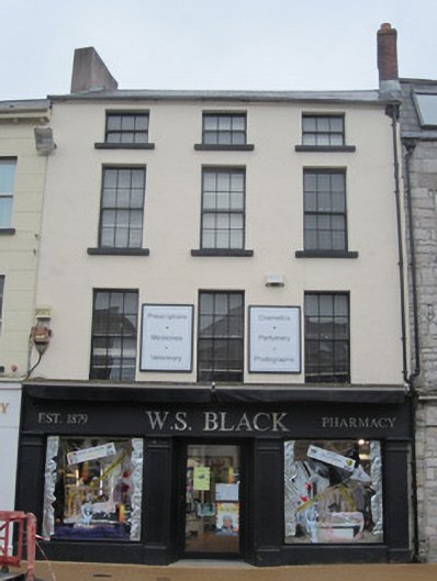 Terraced three-bay four-storey house, built c.1830, in use as shop. Pitched slate roof with rendered eaves course, rendered chimneystacks, and cast-iron rainwater goods. Lined and ruled rendered walls to upper floors, and with render shopfront to ground floor. Square-headed window openings with stone sills and timber sliding sash windows, six-over six pane to middle floors and three-over-three pane to top floor. Shopfront comprises fluted pilasters with simple bases and capitals framing square-headed fixed display windows and central glazed door.