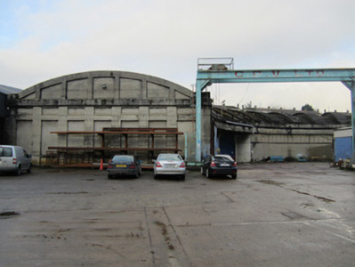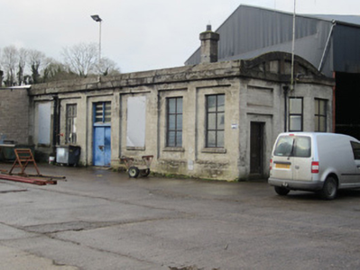 Reinforced concrete structure forming sector of circle, built c.1925. Originally containing twelve bays for housing locomotives, now in use as storage for engineering firm. Vaulted concrete roof. Square-headed window openings with glazed timber-framed windows and concrete sills to north/rear and south-east elevations. Detached six-bay single-storey reinforced concrete office building, with bay window to east elevation, located to south-west of locomotive shed. Square-headed window openings with glazed timber-framed windows and concrete sills. Square-headed door opening with timber door to east elevation. Set in large yard with former goods shed located to south.
