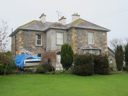 Three-bay two-storey L-plan former manse, built c.1870, with slightly lower entrance projection to front re-entrant corner, canted bay window to projecting east end bay of front, and single-storey hipped-roof extension to rear. Hipped slate roof with ridge tiles, smooth rendered shouldered chimneystacks with rendered copings and terracotta pots, and some cast-iron rainwater goods. Roughly dressed rubble limestone walls built to courses, with ashlar sandstone block-and-start quoins. Roughcast rendered walls with smooth rendered plinth course to return, smooth rendered bay window and smooth rendered upper storey to entrance projection. Square-headed window openings with replacement timber sliding sash windows, red brick block-and-start surrounds, smooth rendered reveals and limestone sills. Round-headed doorway with panelled door, fanlight, moulded surround, set within red brick block-and-start surround. Two-storey outbuilding to northwest, built c.1870, having three-bay first floor and four-bay ground floor, with hipped slate roof, roughcast rendered rubble limestone walls, segmental carriage arch, flanked by square-headed doorways and window. Three-bay single-storey former Methodist church built c.1966 to north-east with gabled porch projection. Set within own grounds.