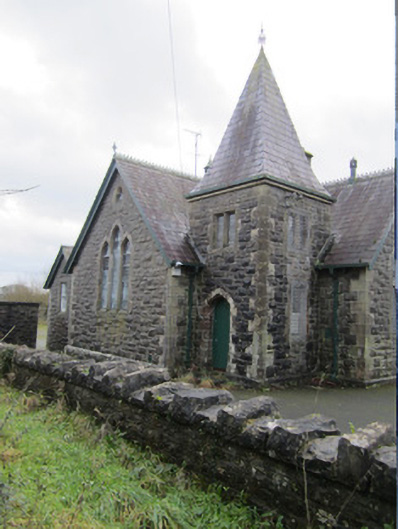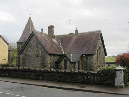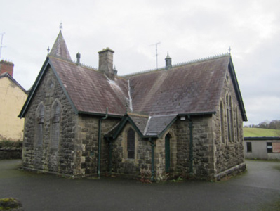 Detached four-bay single-storey limestone-walled Gothic Revival former school, built 1902, on almost cruciform plan, with square plan two-stage tower to east end, gable-fronted projection to front elevation, and entrance porch to re-entrant corner of front elevation. Slate roof, pyramidal to tower and pitched elsewhere, with ridge tiles topped with cast-iron cresting, cast-metal vents to roof, cast-iron finials to gables, cut-stone chimneystack to projecting bay and to rear with moulded coping and terracotta pots, cut-stone eaves course to tower, timber bargeboards to gables, and square-profile cast-iron rainwater goods with decorative brackets. Rock-faced walls built to courses with ashlar block-and-start quoins. Limestone plaque to front elevation with lettering 'Clones National School Fort-View'. Pointed arch window openings, paired to projecting bay, four-light to gables of main block, and square-headed elsewhere, two-light to top stage of tower, with lead glazing, chamfered ashlar block-and-start surrounds. Quatrefoil openings above gable windows. Tudor-arch doorways to porch and to tower, with battened timber doors and chamfered ashlar block-and-start surrounds. Set within own grounds, bounded by rock-faced limestone wall with double-leaf cast-iron gate hung on rubble stone piers with caps.