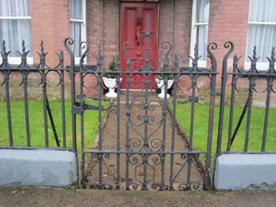 Two-storey end of terrace house, built c.1910, with two-bay first floor and three-bay ground floor. Canted bay windows flanking entrance doorway, all under lean-to roof that continues along front of adjoining houses of terrace. Two-storey return to rear. Pitched slate roof with red brick chimneystacks, red brick eaves course and square-profile cast-iron rainwater goods. Yellow brick walls with red brick block-and-start quoins, and with red brick to walling of canted bay, and rendered walling to return. Blank carved sandstone plaque to first floor. Segmental arch double window opening to first floor and square-headed openings to bay windows, with one-over-one pane timber sliding sash windows, red brick block and start surrounds, and painted sills. Square-headed door opening with panelled timber door. Decorative wrought-iron railings over smooth rendered plinth with similar wrought-iron pedestrian gate to garden to front of house, and similar double-leaf wrought-iron vehicular gate to west with rendered piers.