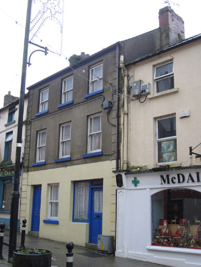 Terraced three-bay three-storey house, built c.1880, to replace or extend pre-existing two-storey house. Present building incorporates former shop and has full-width single-storey flat-roof extension to rear. Pitched slate roof with black clay ridge tiles, brick chimneystacks to ends of roof and smooth rendered eaves course supporting replacement steel rainwater goods. Smooth ruled-and-lined cement render to front elevation, painted to ground floor, with channelled quoin strips, and smooth cement render to rear. Square-headed window openings with painted stone sills, and having margined one-over-one pane timber sliding sash window with convex horns to front, and replacement uPVC and timber to rear. Square-headed timber display window to former shop. Square-headed doorways to ends of front elevation, half-glazed timber with overlight to former shop, and panelled timber door to house, with single concrete step to each doorway.