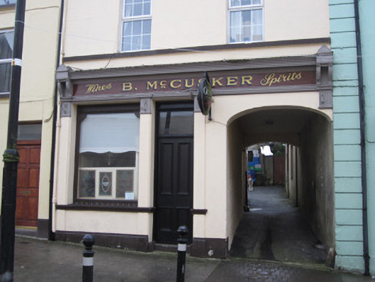 Terraced two-bay three-storey house and public house, built c.1880, having integral carriage archway to north end, and small catslide extension to rear connecting to northern half of single-storey outbuildings and shared with neighbouring property. Pitched slate roof having black clay ridge tiles, smooth cement rendered brick chimneystacks to ends of roof. Mixed cast-iron and replacement metal rainwater goods on smooth-rendered eaves course to front elevation and on exposed rafter ends to rear. Painted, smooth rendered ruled-and-lined brick walls with smooth rendered ground floor beneath fillet moulded first floor sill course, and with roughcast render to rear. Square-headed window openings have painted stone sills and replacement uPVC frames throughout. Shopfront has render pilasters with moulded plinths and fluted capitals flanking central doorway and display window its south. Panelled timber door with overlight, and moulded timber display window with carved timber spandrels and decoratively carved ventilator panel above, moulded render sill that continues to pilasters, with smooth-rendered stall riser having moulded plinth. Plain fascia with painted lettering, and moulded cornice with decorative carved timber end pieces. Archway has three-centred arch and stone wheelguard.