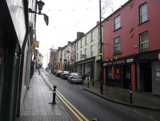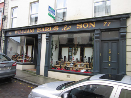 Terraced five-bay three-storey house over shop with attic, built c.1860, having an integral carriage archway to north end of front elevation and two-storey flat-roof extension to rear. Pitched fibre-cement tiled roof having black clay ridge tiles, cast-iron rooflights on rear elevation, single centrally placed smooth-rendered chimneystack, and half-round cast-iron rainwater goods on smooth-rendered eaves course. Painted, smooth rendered ruled and lined walls with single tie-plate between upper floors, and channelled render quoin strips to ends of front elevation. Roughcast render to rear elevation. Punch-finished block-and-start sandstone quoins visible to rear north-west corner. Square-headed window openings with painted stone sills, replacement uPVC frames to front and replacement timber to rear elevation. Timber shopfront has recessed square-headed shop doorway flanked by large timber-framed display windows with moulded timber sills, and with house doorway to north end. Panelled timber pilasters flank display windows and house doorway, with scrolled consoles having panelled blocks above and supporting plain fascia with fluted end pieces and painted lettering. Smooth rendered stall risers beneath moulded render sills to display windows. Shop doorway has double-leaf timber panelled door, and that to house has square-headed panelled timber door with overlight and pair of smooth rendered steps. Archway has three-centred arch with spur-stone and channelled render surround. Within passageway is square-headed panelled timber door with overlight. Detached three-bay two-storey outbuilding to rear with pitched fibre-cement slate roof and stone walls.