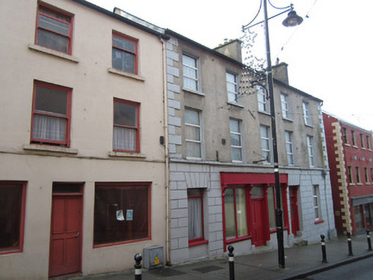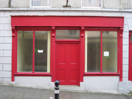 End-of-terrace five-bay three-storey house with attic and ground floor shop, built c.1860, having two-bay two-storey lean-to extension to rear elevation. Pitched fibre-cement slate roof having black clay ridge tiles, replacement rooflights on south side of rear elevation and smooth cement-rendered chimneystacks on ridge just north of centre and on north gable. Replacement metal rainwater goods on smooth-rendered eaves course. Smooth cement rendered walls throughout, with front having smooth rendered upper floors with single tie-plate between floors, channelled render to ground floor, and block-and-start render quoins. Fillet-moulded sill course to first floor. Square-headed window openings with painted stone sills, having replacement uPVC frames to front and replacement timber to rear. Symmetrical timber shopfront to two middle bays has moulded timber pilasters flanking doorway and display windows, with scrolled consoles and rendered plinths supporting plain fascia, door is double-leaf timber panelled with overlight and moulded lintel, and display windows have chamfered surrounds and timber mullions. Shopfront originally part of symmetrical arrangement with flanking square-headed timber doors of which that to south has been replaced with timber window but that to north retains partially glazed timber panelled door with chamfered detailing and similar moulded framing piers with scrolled consoles supporting small architrave moulding as on adjacent shopfront. Beyond this doorway to north is another window demarcating end bay of this building which terminates with gap providing access to rear.