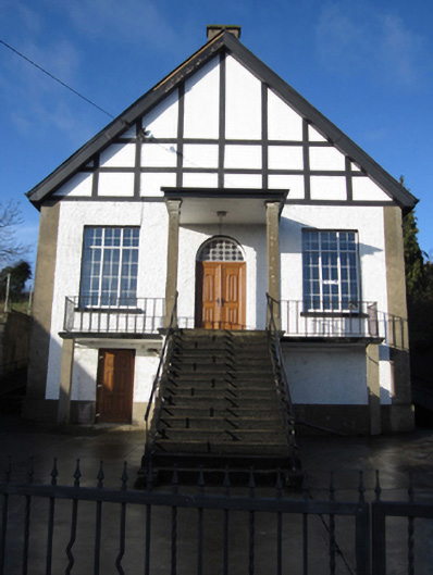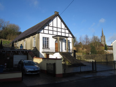 This whimsical twentieth-century building is a relatively early example of concrete construction in this part of Ireland. Its form is a medley of architectural styles and devices, from the pilasters to the side elevations to the Mock Tudor frontage. The canopy and the balcony to each side of the entrance, and the tall flight of steps gives it an elegant appearance to the street.