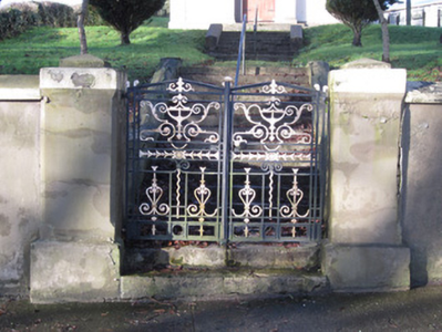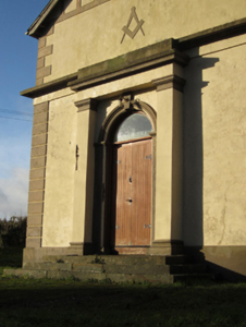 Detached gable-fronted two-storey Masonic hall, built 1936, having single-bay entrance elevation and three-bay side elevations, with single-storey flat-roofed extension to rear (north-west) end. Slightly projecting surround to entrance. Pitched fibre-cement slate roof with black clay ridge tiles, with small smooth-rendered chimneystack to rear gable, and half-round cast-iron rainwater goods on timber fascia fixed to exposed slightly overhanging rafter ends. Painted smooth rendered walls with projecting smooth render base. Lower part of gable-front framed by render quoined pilasters, with render platband and moulded cornice above, and upper gable-front having render block-and-start quoins and render strips mimicking timber framing. Render square and compass symbol to area above entrance. Entrance comprises engaged square columns of smooth rendered brick with moulded bases and capitals supporting moulded entablature and parapet. Square-headed window openings with double four-over-four pane timber sliding sash frames with ogee horns and concrete sills. Cut-stone steps to entrance. Round-headed doorway flanked by plain pilasters with moulded imposts and archivolt and having double-leaf timber battened door with fanlight. Building set back from street, with terraced lawns to front having mature trees and path with concrete steps leading from ornate double-leaf wrought-iron pedestrian gate set to smooth rendered piers with plinths and pyramidal caps, set in smooth rendered boundary wall.