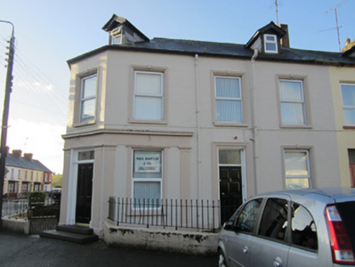 Terraced two-bay two-storey house with dormer attic, built c.1910. Slate roof with red brick chimneystack. Smooth rendered lined and ruled walls with smooth rendered plinth course. Slate hanging to sides of dormer window. Square-headed window openings with replacement uPVC windows, moulded render surrounds with keystone details, and painted sills. Square-headed door opening with moulded surround, timber panelled door with overlight, and moulded surround. Small garden to front, bounded by rendered plinth wall with wrought-iron railings and pedestrian gate.
