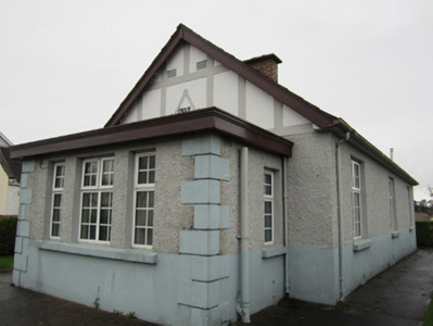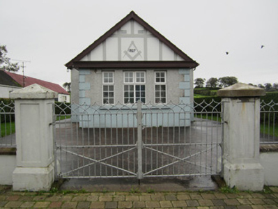 Freestanding three-bay single-storey gable-fronted masonic hall, dated 1927, with lower single-storey flat-roofed porch recessed to front, and lean-to unit recessed to rear. Pitched asbestos slate roof with timber fascia and soffit, brick chimneystack, metal roof vent, and replacement rainwater goods. Walls roughcast rendered above sill level and smooth rendered below, with smooth rendered block-and-start quoins to porch. Gable has render timber-frame effect detailing, with mason's square detail and date '1927'. Square-headed window and door openings with replacement fittings. Recent steel railing and gate, with smooth rendered plinth walls and piers having pyramidal caps, to street front. Concrete forecourt inside gate, with lawns to each side.