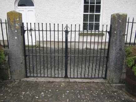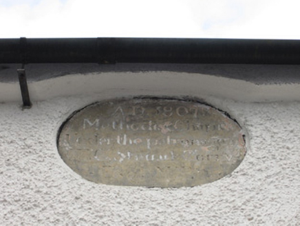Detached three-bay former Methodist church, dated 1807, later in use as Orange hall, and recently extended to rear (north). Pitched slate roof with terracotta ridge cresting and finials to gables, replacement rainwater goods, and render eaves course. Roughcast rendered walls having oval-shaped cut sandstone plaque to front elevation with lettering 'AD 1807 Methodist chapel under the patronage of TC Steuart Corry Esq. MP', and render plinth. Round-headed window openings with six-over-six pane timber sliding sash windows with spoked heads and tooled limestone sills. Square-headed double four-over-four pane timber sliding sash window to west gable. Round-headed door opening having double-leaf timber panelled door with fanlight. Wrought-iron gates with flanking cut limestone tapering octagonal piers, roughcast rendered boundary wall with sandstone coping and wrought-iron gates with decorative finial.