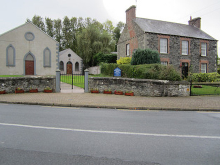 Detached three-bay two-storey former manse, built c.1850, with two-storey additions to rear. Pitched slate roof with grey clayware ridge tiles, red brick chimneystacks, and cast-iron profile rainwater goods. Coursed limestone rubble walls with ashlar sandstone rusticated block-and-start quoins, with sandstone brackets at eaves and continuing course of brackets to gables. Sections of red brick walling to chimney flues to gables. Square-headed window openings with patent margins, red brick block-and-start surrounds and voussoirs, stone sills, and horned timber sliding sash windows, two-over-two horizontal pane to first floor, margined one-over-one pane to ground floor, eight-over-eight pane to south gable, and replacement windows to rear. Square-headed door opening with red brick block-and-start surround and voussoirs, and timber panelled door with overlight. Set within own grounds with garden to front having flagstone pathway to gate, fronted to street by decorative railings and gateway of cast-iron, with ornate piers to ends having shield device. Located at centre of Rockcorry village.