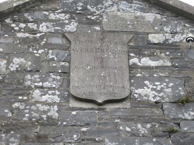 End-of terrace three-bay two-storey gable-fronted former almshouse, dated 1847, with pediment to front elevation. One of row of four almshouses at south side of Rockcorry village. Now unoccupied. Hipped slate roof, gabled to pediment, with grey clayware ridge tiles, and having ashlar coping to pediment, ashlar sandstone chimneystacks with polygonal terracotta pots, and replacement rainwater goods. Squared coursed limestone walling with rusticated block-and-start sandstone quoins, sandstone eaves course at pediment base, and chamfered sandstone plinth. Sandstone shield plaque to pediment inscribed 'THOSE HOUSES WERE ERECTED BY JOS[EPH] GRIFFITH ESQ FOR DESTITUTE WIDOWS A.D.1847'. Roughcast rendered to gable. Square-headed window openings with red brick block-and-start surrounds and voussoirs, and timber sliding sash windows, six-over-six pane to front and with mix of six-over-six and three-over-six pane to rear, with stone sills. Round-arch door opening with red brick block-and-start surround and voussoirs, timber battened door with spoked timber fanlight, and flagstone door-step with cast-iron boot-scraper. Single-cell toilet to rear having concrete walls and lean-to corrugated-iron roof. Shared garden to rear. Set back from street, with garden to front bounded by cast-iron railings and pedestrian gate on chamfered sandstone plinth.